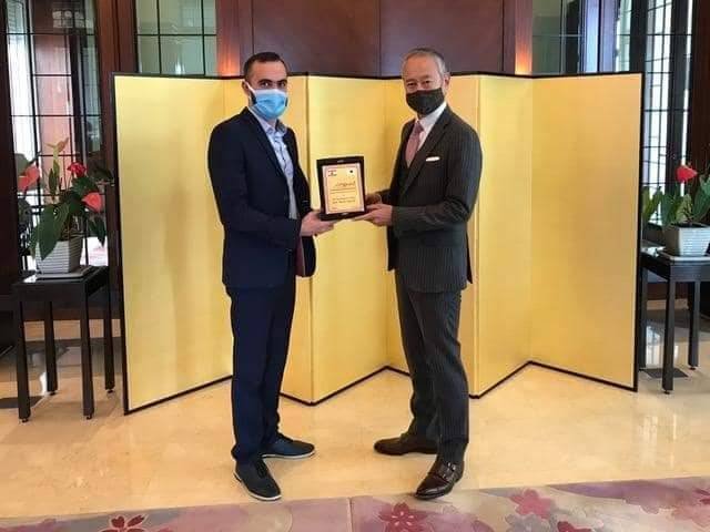 سلم الاعلامي زاريه باريكيان سفير اليابان في لبنان أوكوبو تاكيشي درعا تقديريا للتبرعات التي قدمتها اليابان للبنان بعد انفجار مرفأ بيروت في 4 آب 2020، وكتذكير بالعلاقة الوثيقة بين لبنان واليابان.